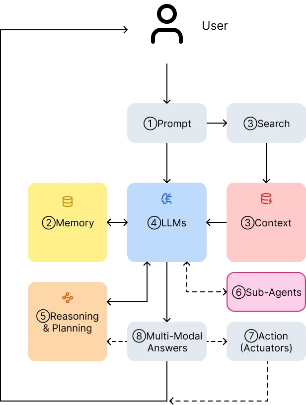 ( Hallucination 방지 및 정확도 향상 기여 ) - LLMsAgentic AI의 브레인 역할. 프롬프트, 메모리 및 컨텍스트 처리해 추론, 응답 및 계획 생성. 전문 LLM 또는 정교한 아키텍처 포함